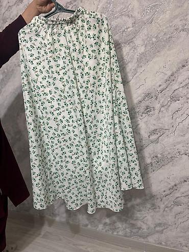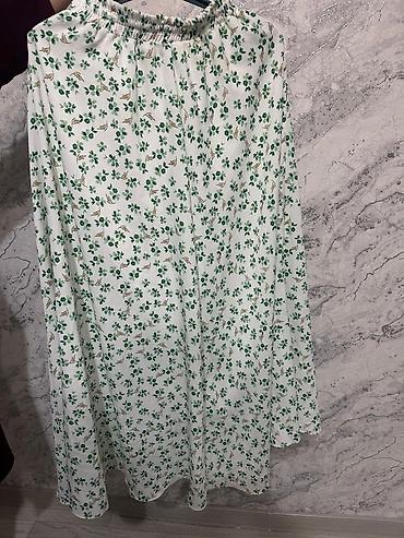 - Юбка: длина миди, свободный А-силуэт, на удобной широкой резинке по талии. Ткань светлая (молочно-белая) с мелким растительным принтом: зелёные листочки и небольшие бежевые веточки. Мягко драпируется, низ слегка расклешён.