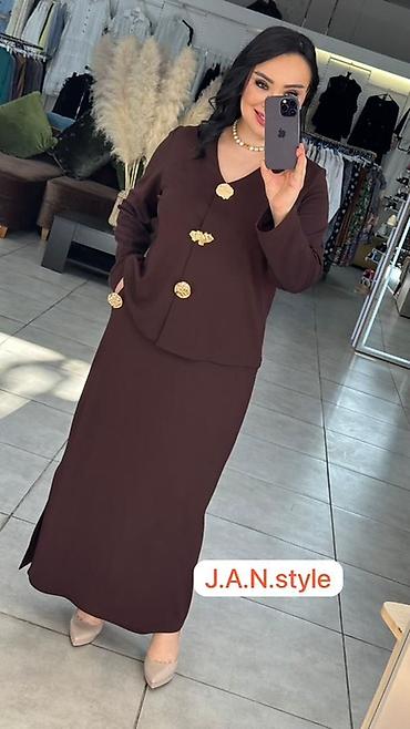 - Состав: юбка макси + укороченный жакет на декоративных крупных золотистых пуговицах.