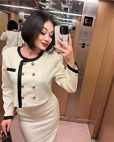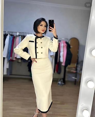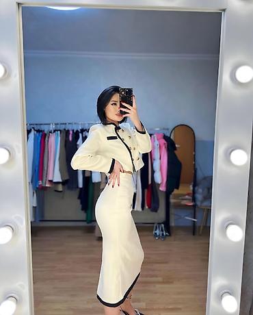Аккуратный силуэт, продуманная длина и контрастная отделка визуально вытягивают фигуру и подчеркивают линии. Комплект можно носить вместе или по отдельности: жакет — с джинсами и брюками, юбку — с блузами и трикотажем.