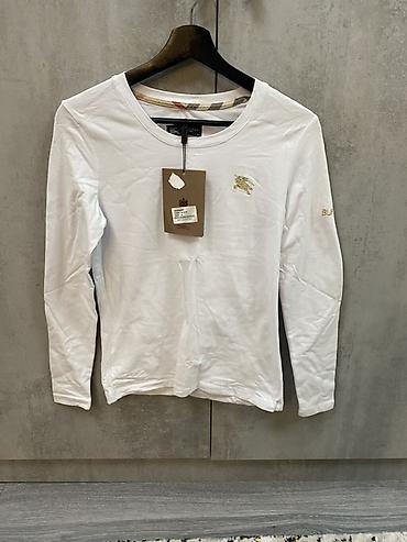 - Burberry: белый лонгслив с круглым вырезом, кант в культовой клетке по внутренней части горловины, небольшая золотистая вышивка всадника на груди и надпись на рукаве.