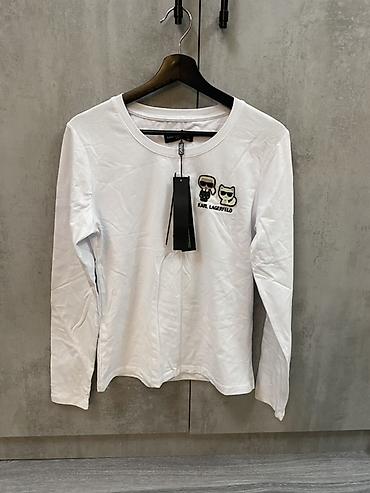 - Karl Lagerfeld: белый лонгслив с круглым вырезом, компактная вышивка персонажей Карла и кошки Шукупет на груди, фирменная бирка.