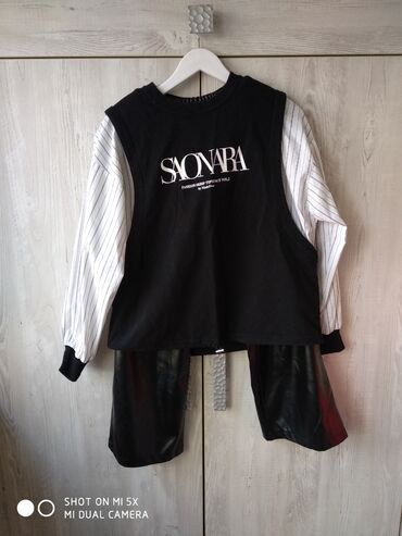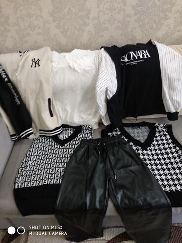Женская одежда. 1) Комплект: рубашка + брюки - Рубашка: бордовая, свободного кроя, длинный рукав, отложной воротник, накладные карманы. - Брюки: черные джоггеры, манжеты понизу, боковые карманы, н...