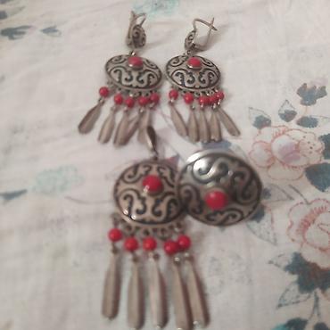 - Серьги на английской застёжке, каждая с медальоном, тремя красными бусинами и подвесками-каплями.
