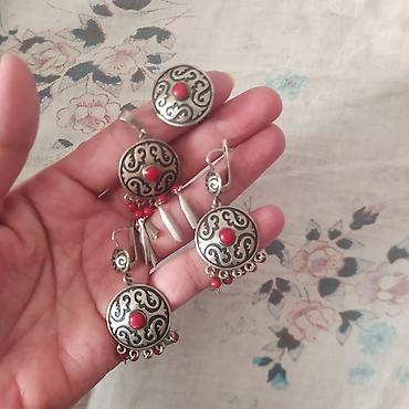 - Дизайн: круглые медальоны с орнаментом; в центре — красная кабошон-вставка. По нижнему краю подвесные элементы — продолговатые «капли» и круглые бусины.