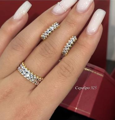 - На фото также показаны кольца из серебра 925 с двуцветным покрытием (белый металл + золотистый тон) и геометрической «пирамидальной» фактурой по окружности. Подчёркивают блеск и создают современный акцент.