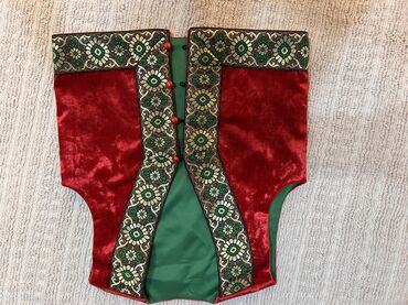 - Жилет из бордового бархата на подкладке цвета изумруд. Передние планки и ворот украшены широкой золотисто‑зелёной тесьмой; застёжка на декоративные пуговицы.