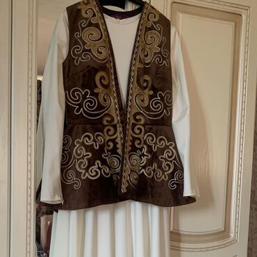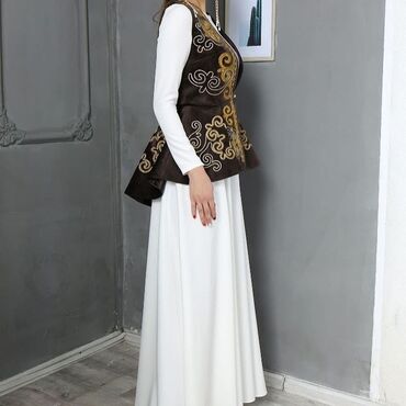 Продаю Женский национальный комплект из бархата с вышивкой. Состав набора: - жилет без рукавов на крючках/петельках спереди; - расклешённая юбка средней длины с запахом спереди. Материал: плотны...