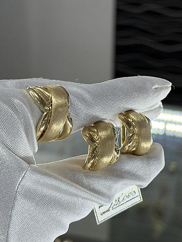 - Комплект №2: серьги и кольцо в едином дизайне «переплетение». Широкая матовая центральная лента пересекается с полированными глянцевыми дугами по бокам, создавая эффект X-образного узла.
