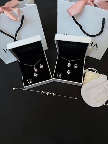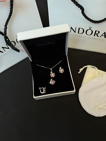 Набор украшений из серебра 925 пробы включающий колье, серьги, кольцо и браслет. Все изделия выполнены в едином стиле с декоративными элементами в виде цветков. Колье и браслет имеют тонкие цепочки, а серьги оснащены английским замком. Комплект поставляется в фирменной упаковке Pandora, что делает его подходящим для подарка или личного использования.