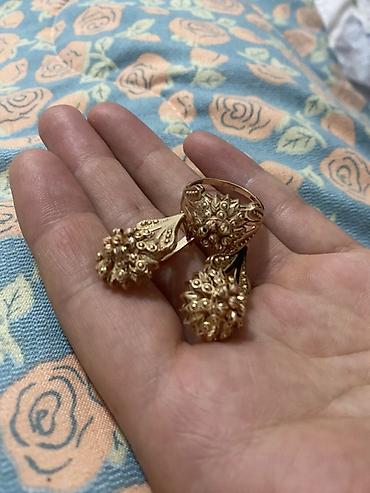 Комплект ювелирных украшений из жёлтого металла: серьги и кольцо в едином дизайне.