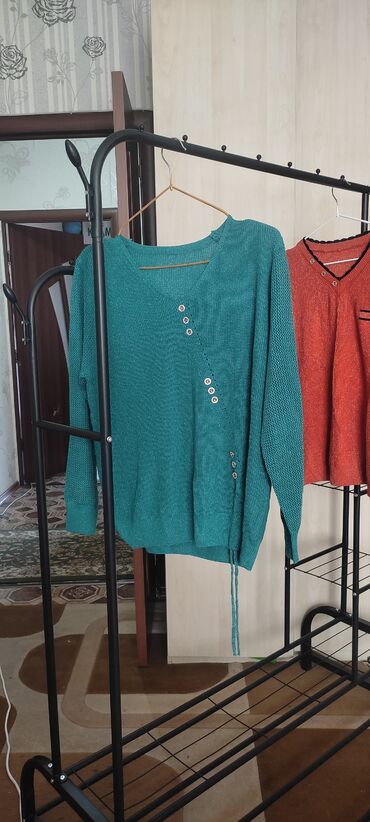 2) Бирюзовый джемпер: V‑образный вырез, асимметричная декоративная планка с рядом пуговиц, удлинённая кулиска/шнур внизу сбоку, комбинированная фактура вязки, эластичные манжеты и низ.
