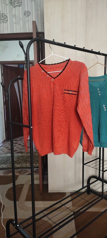 1) Кирпично‑оранжевый джемпер: V‑образный вырез с декоративными пуговицами, контрастная чёрная отделка по горловине, небольшой нагрудный карман с планкой и пуговицей, фактурная вертикальная вязка, эластичные манжеты и нижняя резинка.
