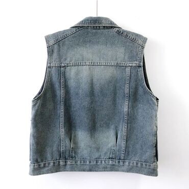 Джинсовый жилет без рукавов с отложным воротником. Застегивается на