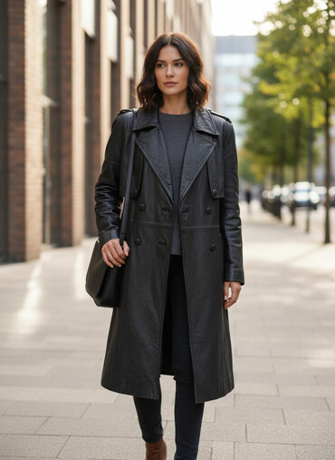 - Длина ниже бёдер, форм-фактор — плащ/тренч из кожи.