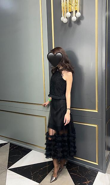 - Эффектный total-black образ из двух частей: топ и юбка.