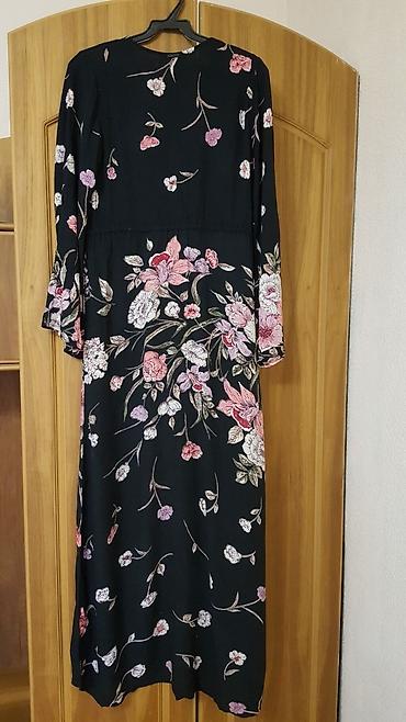 Платье черное, свободного кроя. - Фасон: приталивания нет, А‑силуэт с асимметричным кроем по линии бедра и мягкими клиньями/вольным расклешением низа. - Декор: крупная объемная тканевая роза на г...