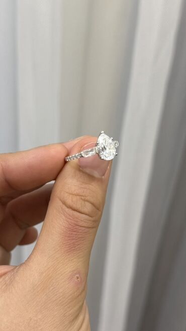 центральным камнем грушевидной (каплевидной) огранки. Камень Муссанит имеется сертификат , Камень закреплён в четырёх крапанов, приподнятая посадка подчёркивает игру света. По бокам — акцентные вставки продолговатой формы, далее по шинке — дорожка мелких камней, плавно сходящая на нет к нижней части обода. Узкая, изящная шинка делает посадку визуально лёгкой и подчёркивает центральный камень. Классический ювелирный бокс в комплекте. Идеально для помолвки или в качестве вечернего аксессуара.
