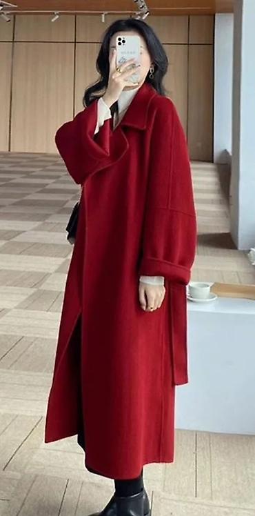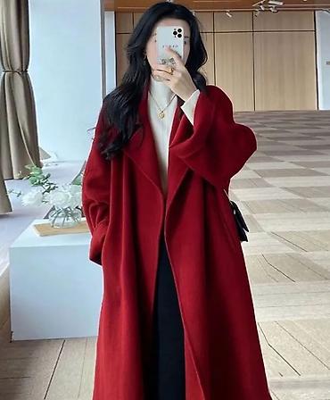 Женское пальто-халат, удлинённое, глубокого бордово-красного цвета.