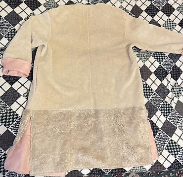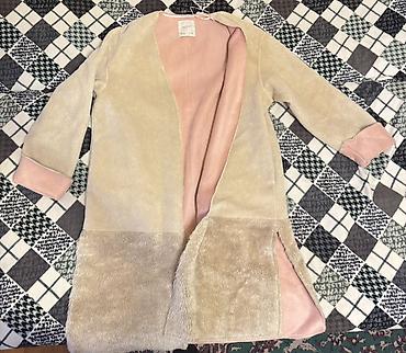 Стильный мягкий кардиган-пальто в нейтральном бежевом оттенке, хорошо сочетается с джинсами и платьями, создаёт уютный образ за счёт фактурной нижней вставки и контрастной розовой изнанки.