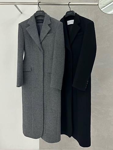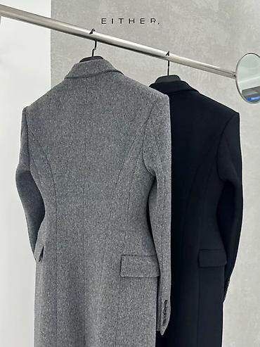 Длинное женское пальто цвета темно-серый меланж. - Фасон: прямой силуэт, длина миди/макси. - Застежка: два пуговицы спереди; дополнительный пояс из той же ткани для акцентированной талии. - Воротн...