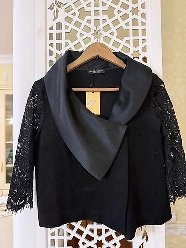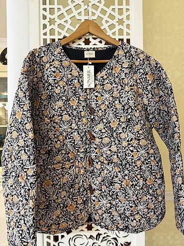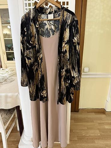 - Накидка/кардиган: бархатистая фактура, принт в черно‑золотисто‑бежевых тонах, свободный силуэт, рукав 3/4–длинный.