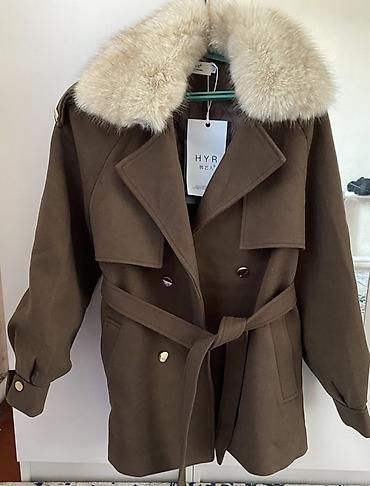 - Крой: укороченное пальто-тренч, прямой силуэт, двубортная застёжка на металлические пуговицы.