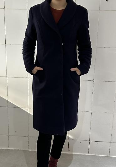 Женское пальто классического кроя, темно‑синего цвета.