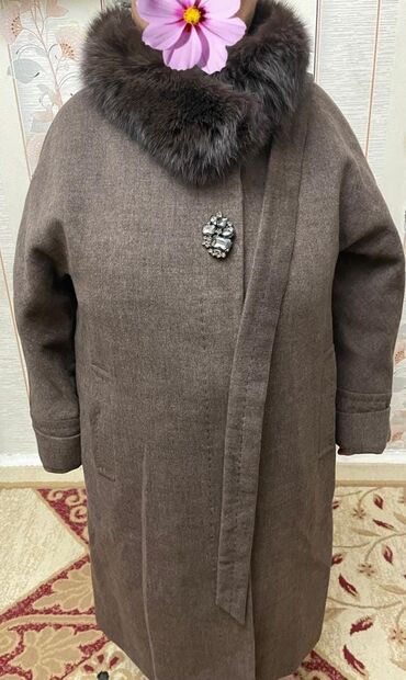 СамовывозПродается новое элегантное женское пальто коричневого цвета с меховым воротником. На груди расположена декоративная брошь. ,