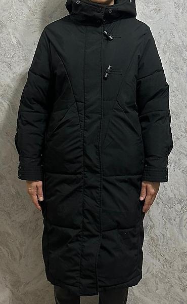 Утеплённое женское пальто-пуховик, черного цвета, длина миди.