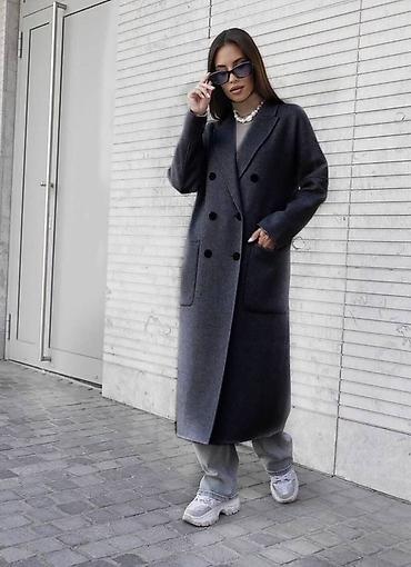 Женское пальто удлинённое, двубортное, серого цвета. - Крой: прямой