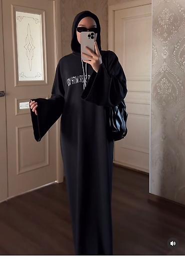 Черное платье-абайя с капюшоном и надписью на груди “YOUR SABR WITH YOU”.