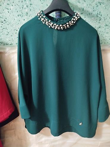 - Изумрудная блузка свободная, рукав 3/4. Высокая горловина с богатой отделкой крупными бусинами/жемчугом, сзади каплевидный вырез на пуговице. Внизу маленький металлический декор.
