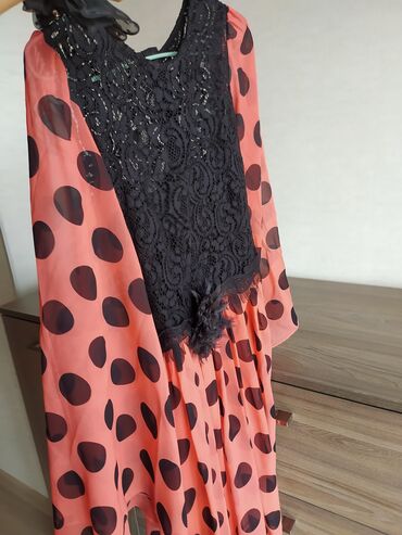 - Рукава и юбка: легкая полупрозрачная ткань персикового оттенка в крупный горох темного цвета.