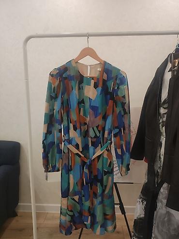 - Принт: абстрактный геометрический, многокрасочный — бирюзовые, синие, терракотовые, бежевые и чёрные оттенки