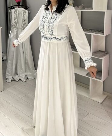 Белое платье в пол с длинными рукавами и вышивкой. Подходит для особых случаев и торжественных мероприятий. Классический и элегантный стиль.