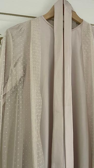 Продаю! Платье +накидка и два пояса! В идеальном состоянии. Нежное длинное платье бежевого оттенка и полупрозрачной накидкой в горошек. Платье имеет прямой крой и длинные рукава, что делает его подходящим для различных мероприятий. Накидка придает образу легкость и воздушность.