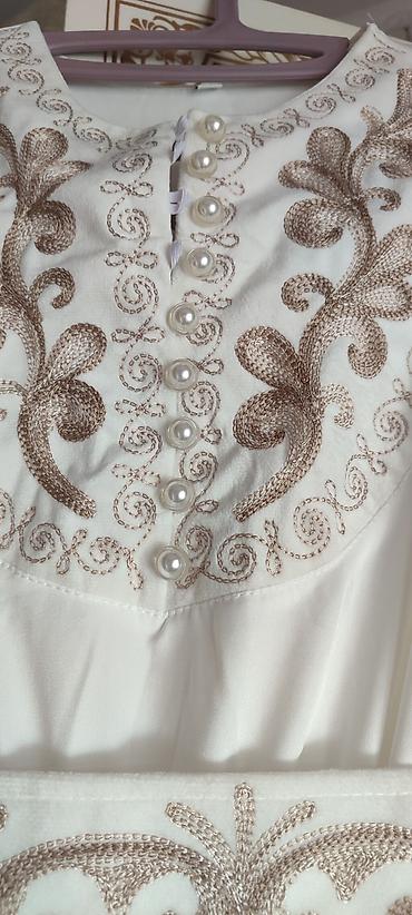 Белое женское платье макси с длинными рукавами и вышивкой. Модель украшена коричневой вышивкой в области груди и на поясе, что придает ей элегантный вид. Одевала 1раз на 30 минут