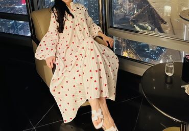 Длинное женское платье макси в белом цвете с принтом в виде красных сердец. Модель свободного кроя с расклешенными рукавами "летучая мышь" и воротником-стойкой. Платье застегивается на ряд пуговиц спереди, обеспечивая удобство при носке. Легкая и воздушная ткань делает его подходящим для повседневного использования, а также для создания романтичных образов.