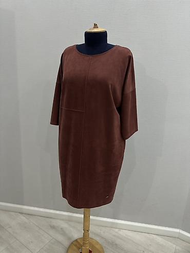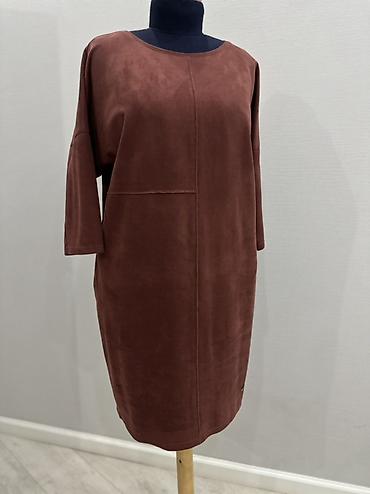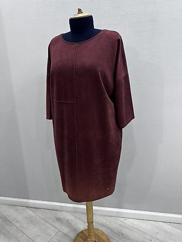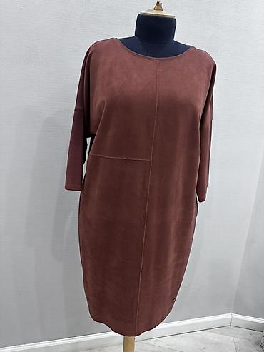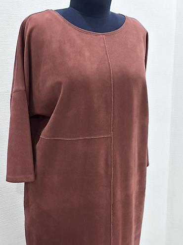 Платье-миди свободного кроя из мягкого бархатистого материала (эффект замши/велюра) в тёплом терракотово-бордовом оттенке.