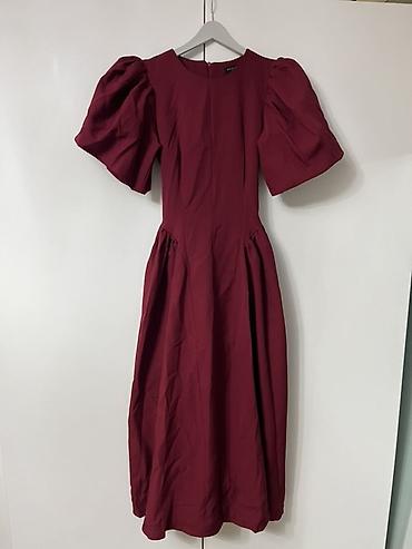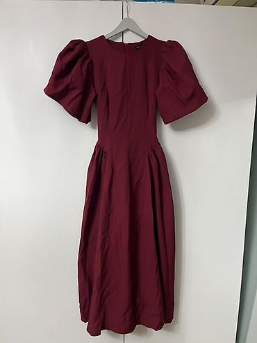 Лаконичный крой подчёркивает талию, пышные рукава добавляют эффектности, миди-длина делает образ элегантным. Цвет — глубокий бордо, легко сочетается с нейтральной и золотистой фурнитурой и обувью.