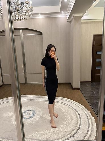 Платье миди черного цвета, трикотажное, облегающего кроя.