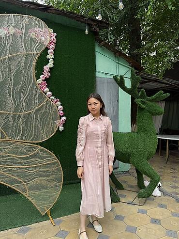 Платье миди с длинными рукавами в нежно‑розовом цвете.