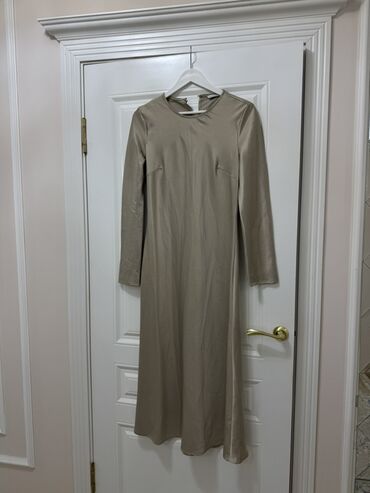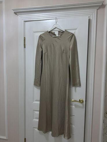 Платье миди с длинным рукавом, однотонное, цвет бежевый/тауп. Прямой силуэт с лёгким расклёшением к низу, округлый вырез горловины. На груди — аккуратные вытачки для посадки. Сзади застёжка-молния в тон, на спинке небольшой разрез у горловины с пуговицей. Ткань гладкая, слегка струящаяся, с лёгким сатиновым отливом. Универсальная базовая модель для офиса, повседневных образов и минималистичных вечерних луков. Совмещается с жакетами, кардиганами и обувью на каблуке или плоском ходу. Цвет нейтральный — легко сочетается с аксессуарами в тёплой и холодной гамме.