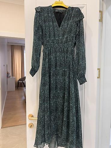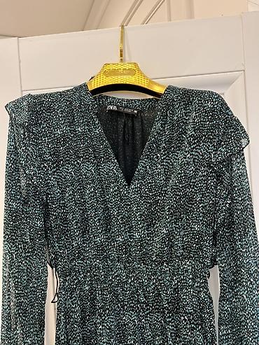 Платье ZARA, миди, с принтом в мелкий абстрактный горошек/крапинки в оттенках бирюзового на темном фоне.