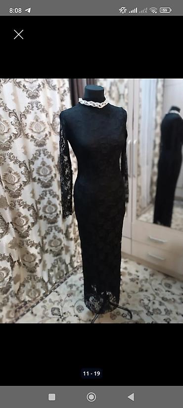 - Черное кружевное платье: полностью из тонкого кружева, полупрозрачные рукава, высокий округлый вырез, длина до щиколотки.