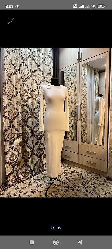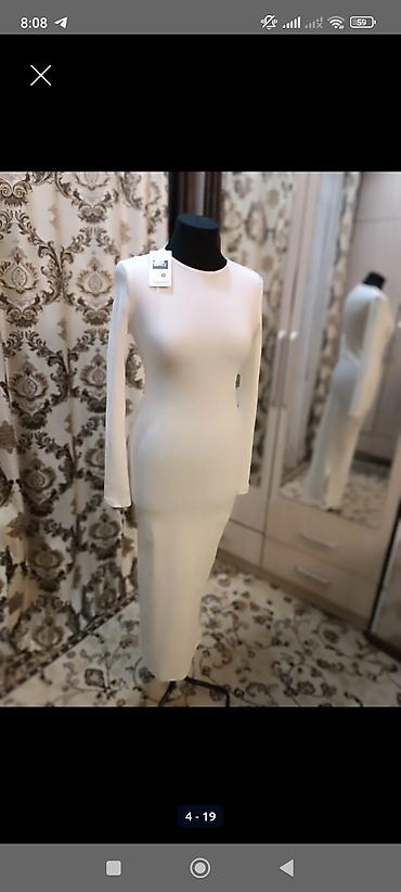 - Белое однотонное платье: гладкий стрейч-трикотаж, облегающий крой, закрытый круглый вырез, длинные рукава, длина миди/макси; на плече бирка.