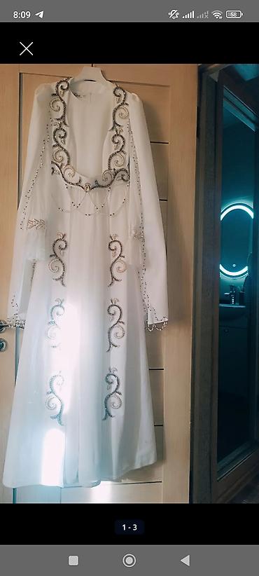 - Белое нарядное платье/накидка: легкая ткань с богатыми декоративными элементами — вышивка и аппликации стразами и жемчужинами по полочкам, рукавам и подолу; расклешенная юбка, рукава с лёгкими воланами.