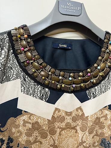 - Круглый вырез, богато украшенный нашивными элементами: металлические детали, цепочки и разноцветные бусины — эффект «встроенного ожерелья».