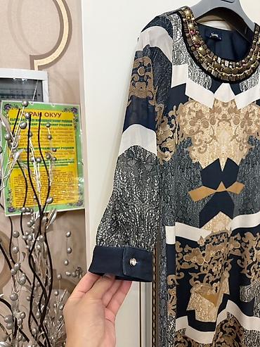 - Комплексный принт: сочетание темно-синего, кремового и золотистого оттенков с мотивами кружева и барочных орнаментов; контрастные геометрические вставки.