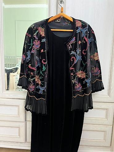 Платья и комплект 1) Черное вечернее платье с асимметричным кроем - Верх: полупрозрачная сетка с драпировкой, рукава длинные, спущенная линия плеча - Низ: длинная драпированная юбка с эффектом зап...